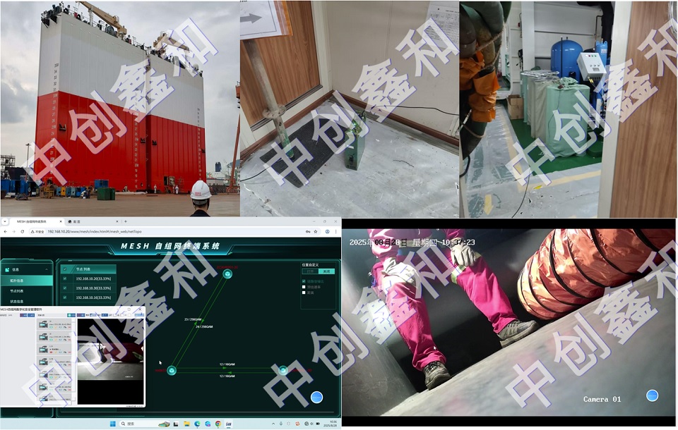 测试在某船厂船只压载舱密闭空间环境下,自组网设备的连接情况以及组网传输情况;同时把压载舱里面的采集视频回传到地面指挥部。