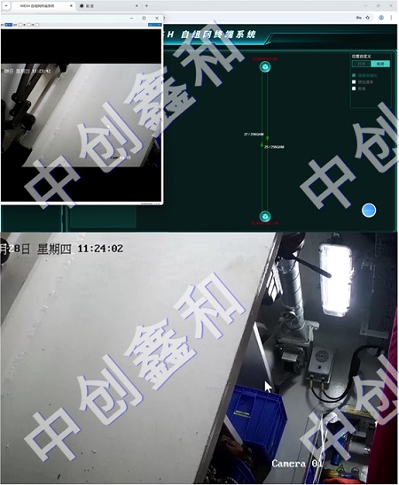 一台mesh自组网基站位于船厂地面一楼指挥部;背负电台以及IP摄像头前往压载舱前端机动测试,IP摄像头通过连接背负电台的网络回传视频到地面指挥中心。经过测试,摄像头在往压载舱负二层行走中,同时回传视频到地面指挥中心,视频传输效果良好;摄像头固定在压载舱负二层时,回传到地面指挥部,视频清晰流畅,测试效果良好。