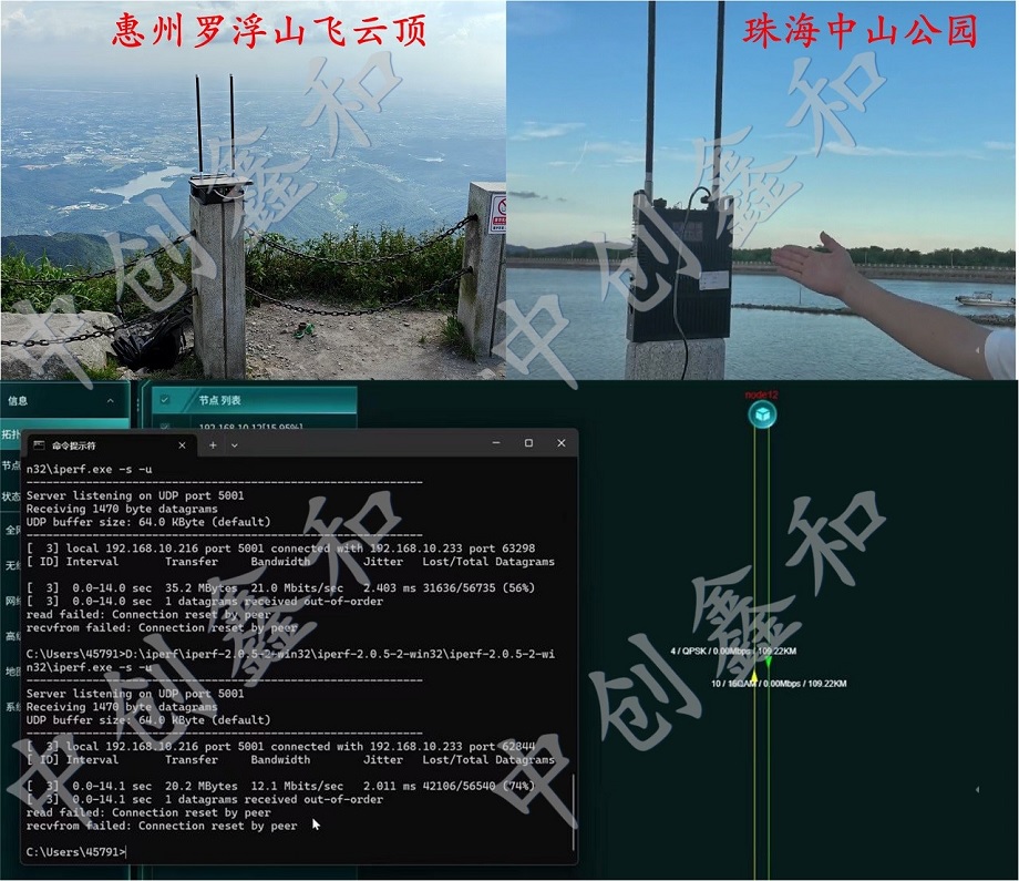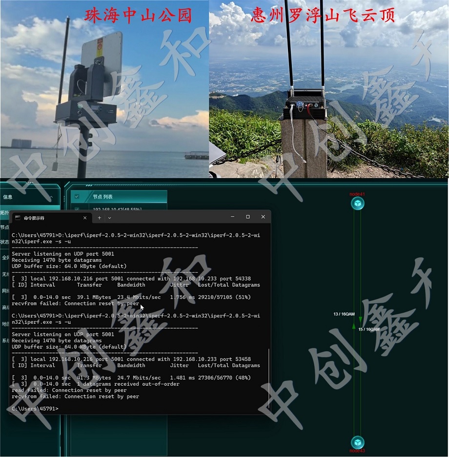 测试在罗浮山飞云顶到珠海中山公园远距离110km环境下,自组网设备的连接情况以及组网传输情况;同时传输罗浮山飞云顶的采集视频到珠海地面端,观察视频传输效果。